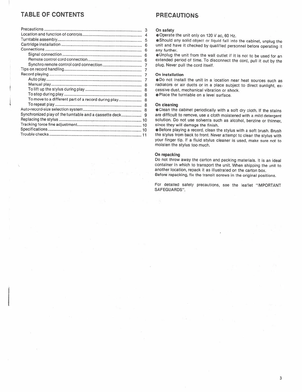 Sony PS-FL7II - Precautions; On Safety; On Installation; On Cleaning