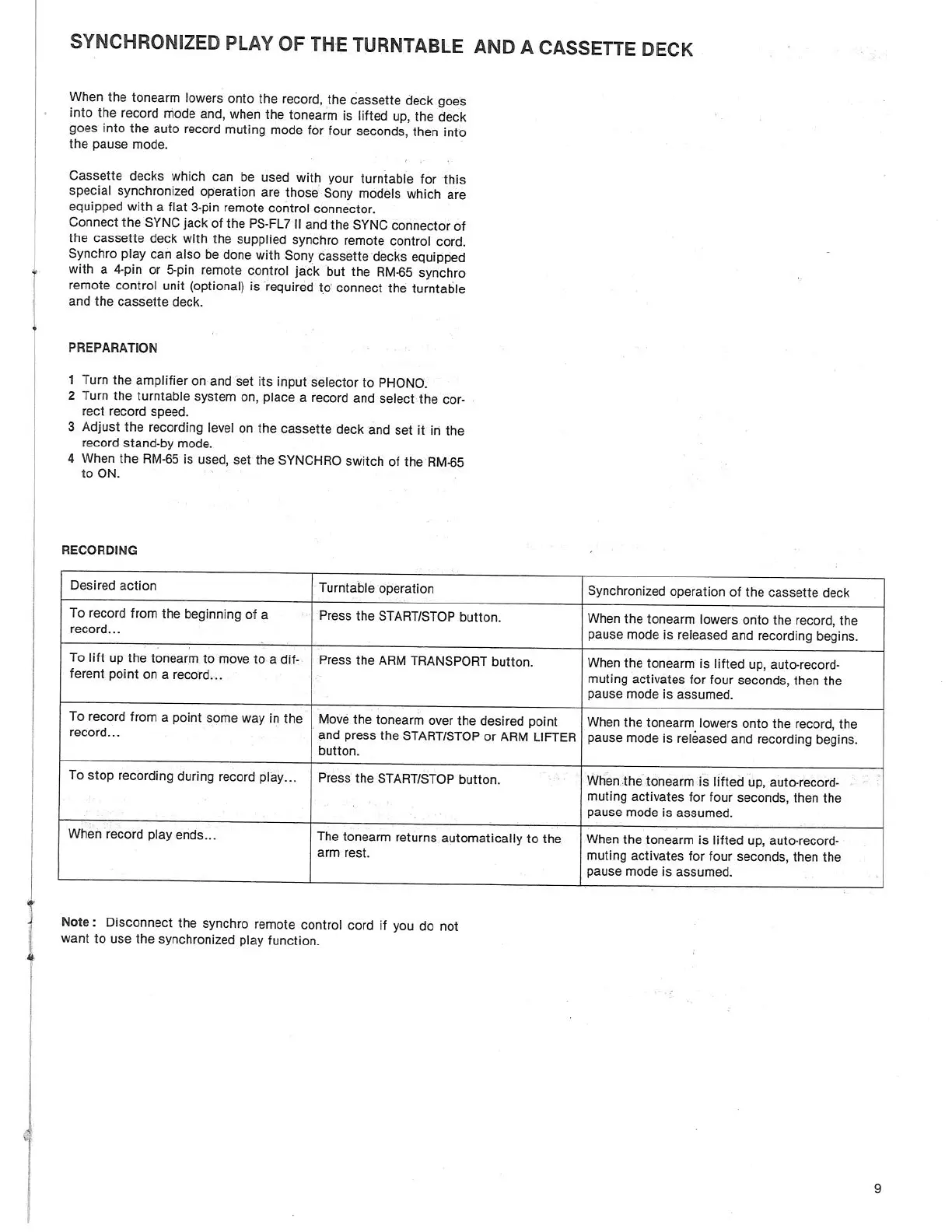 Sony PS-FL7II - Synchronized Play of Turntable and Cassette Deck; Preparation; Recording Process
