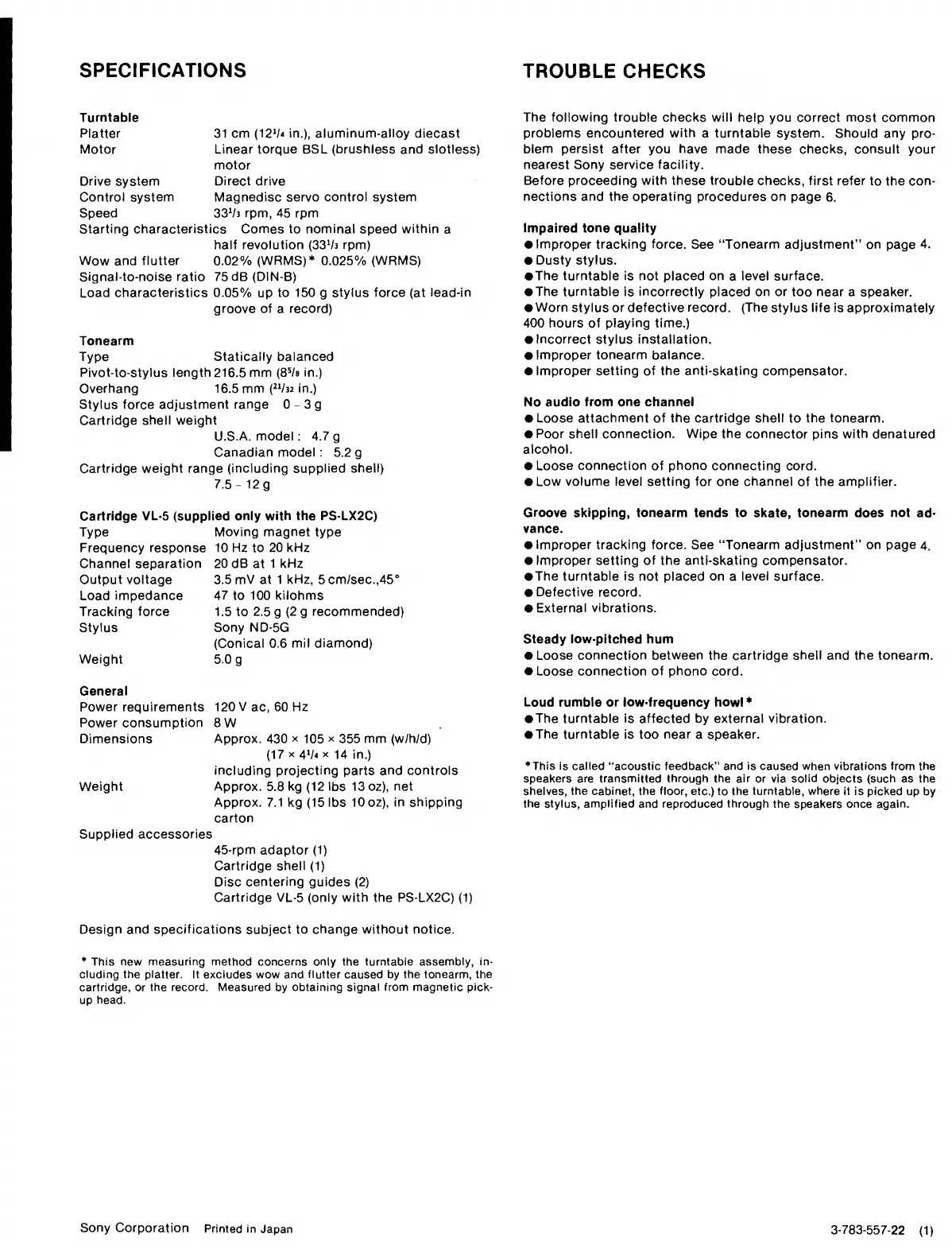 Sony PS-LX2 - Trouble Checks; Impaired Tone Quality Troubleshooting; No Audio from One Channel Troubleshooting; Groove Skipping and Skating Troubleshooting