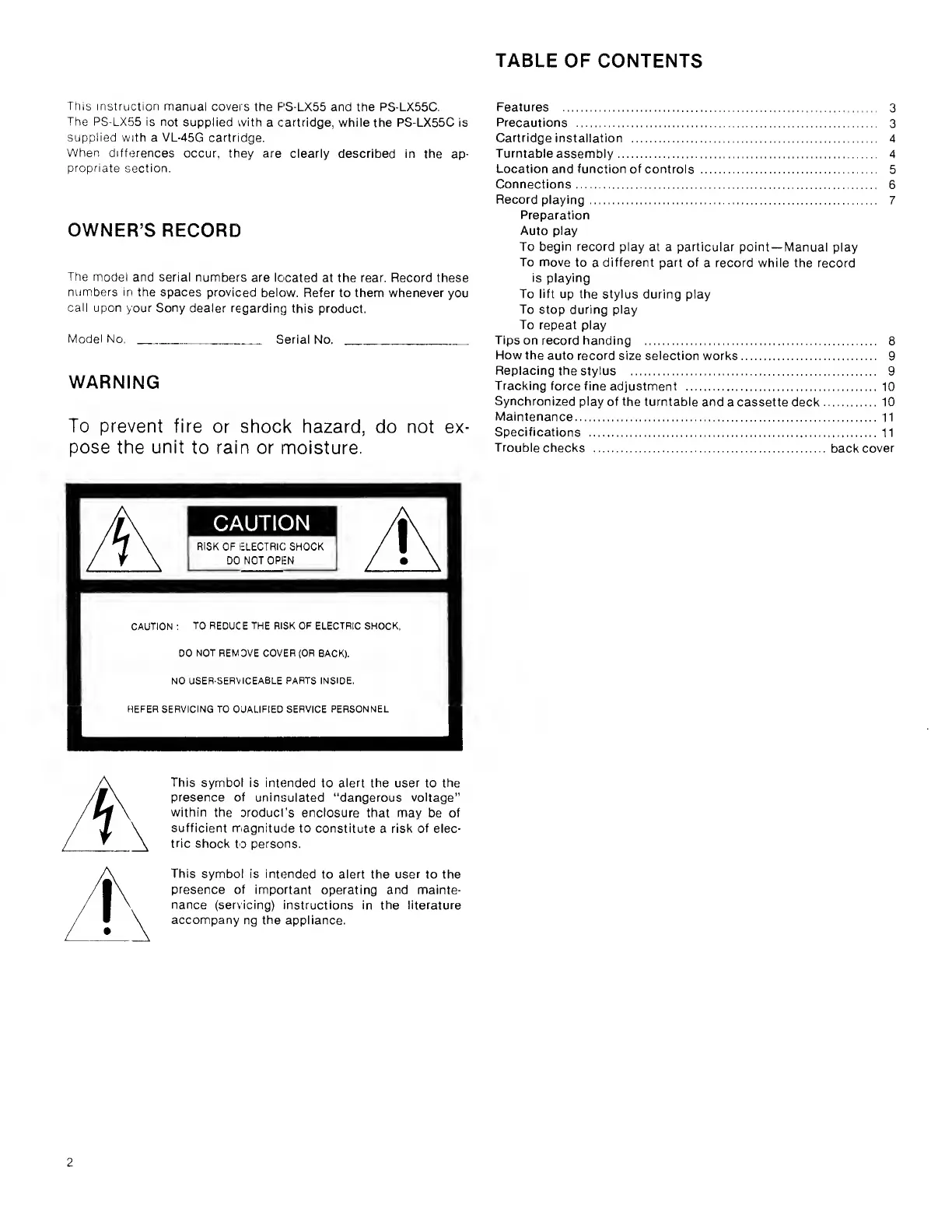 Sony PS-LX55 - Owners Record and Warnings; Owners Record; Safety Warning