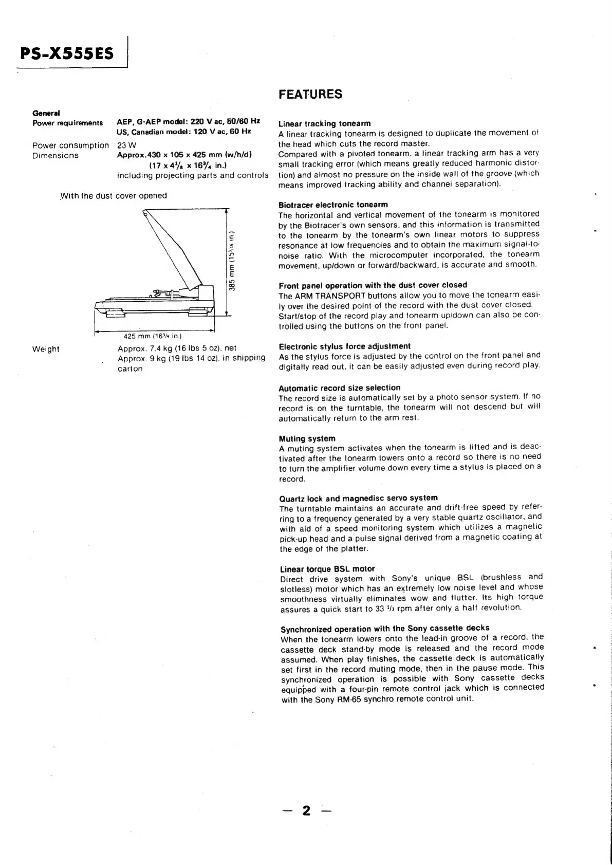 Sony PS-X555ES - General Specifications; Power, Dimensions, and Weight; Product Features; Tonearm Technology