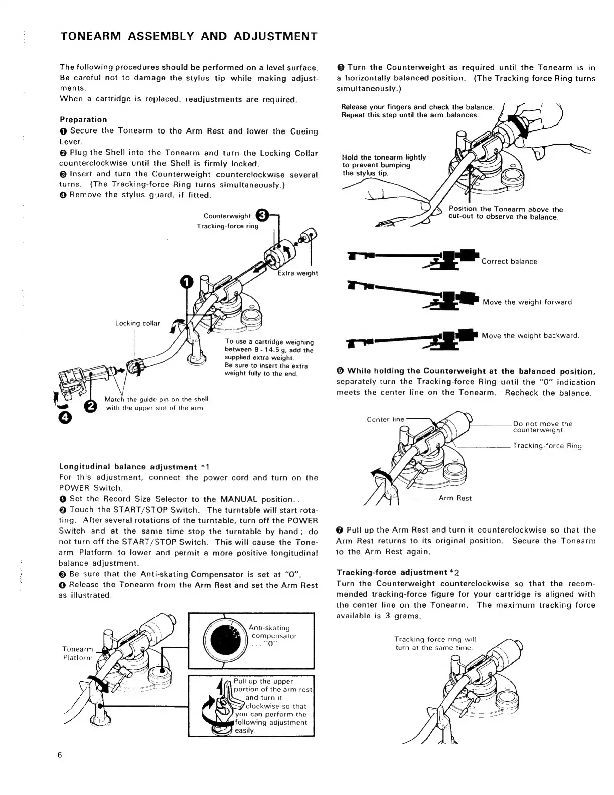Sony PS-X6 - Tonearm Assembly and Adjustment; Longitudinal Balance Adjustment; Tracking-force Adjustment
