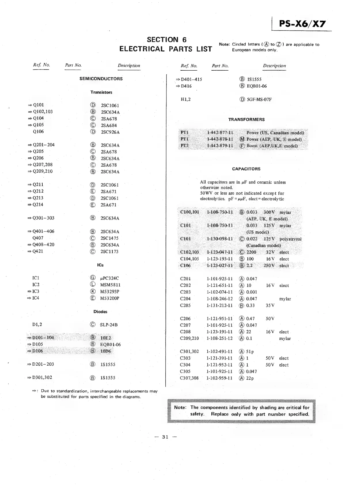 Sony PS-X7 - SECTION 6 ELECTRICAL PARTS LIST; SEMICONDUCTORS; TRANSFORMERS; CAPACITORS