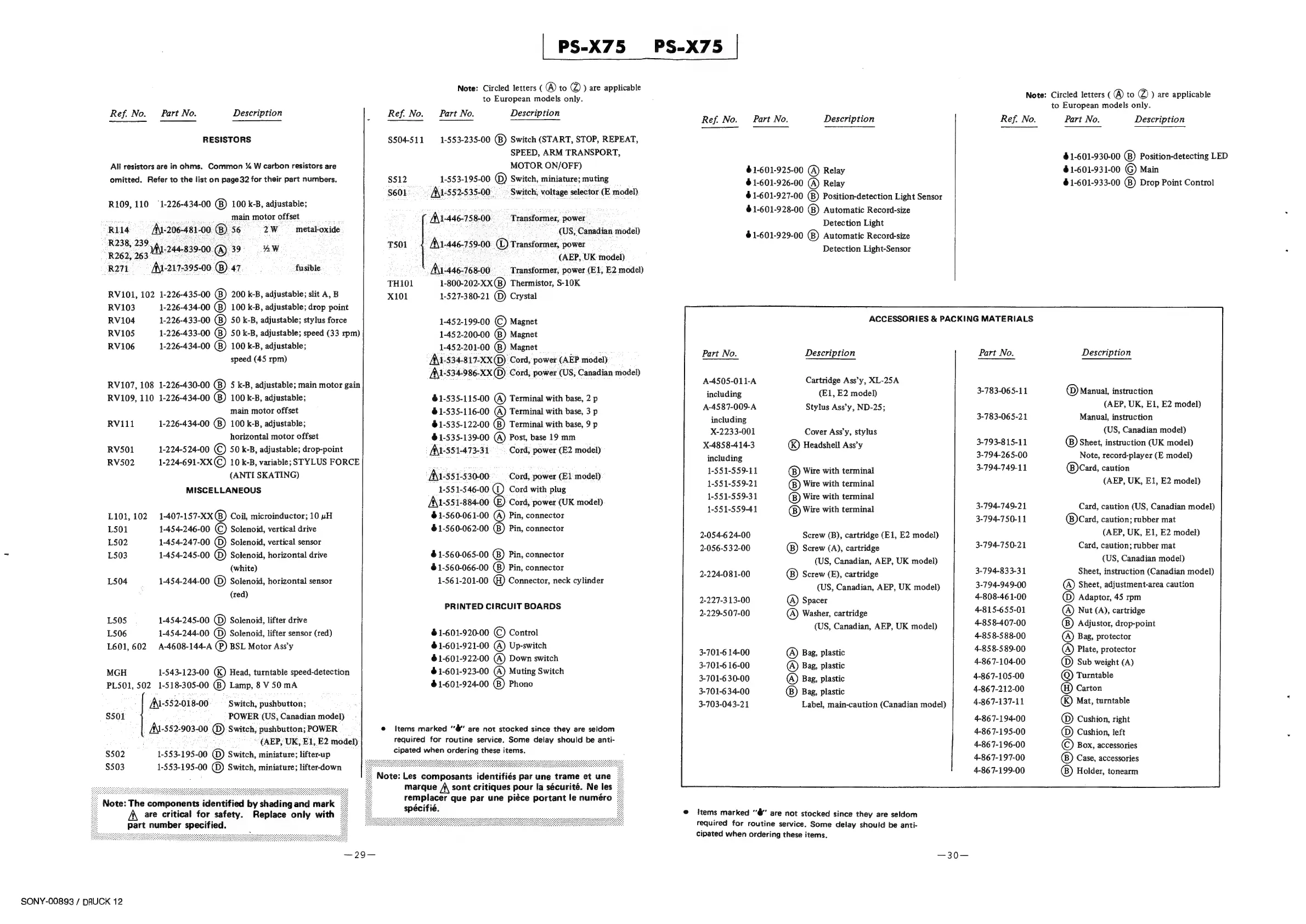 Sony PS-X75 - Electrical Parts List - Resistors and Boards; Resistor Specifications and Part Numbers