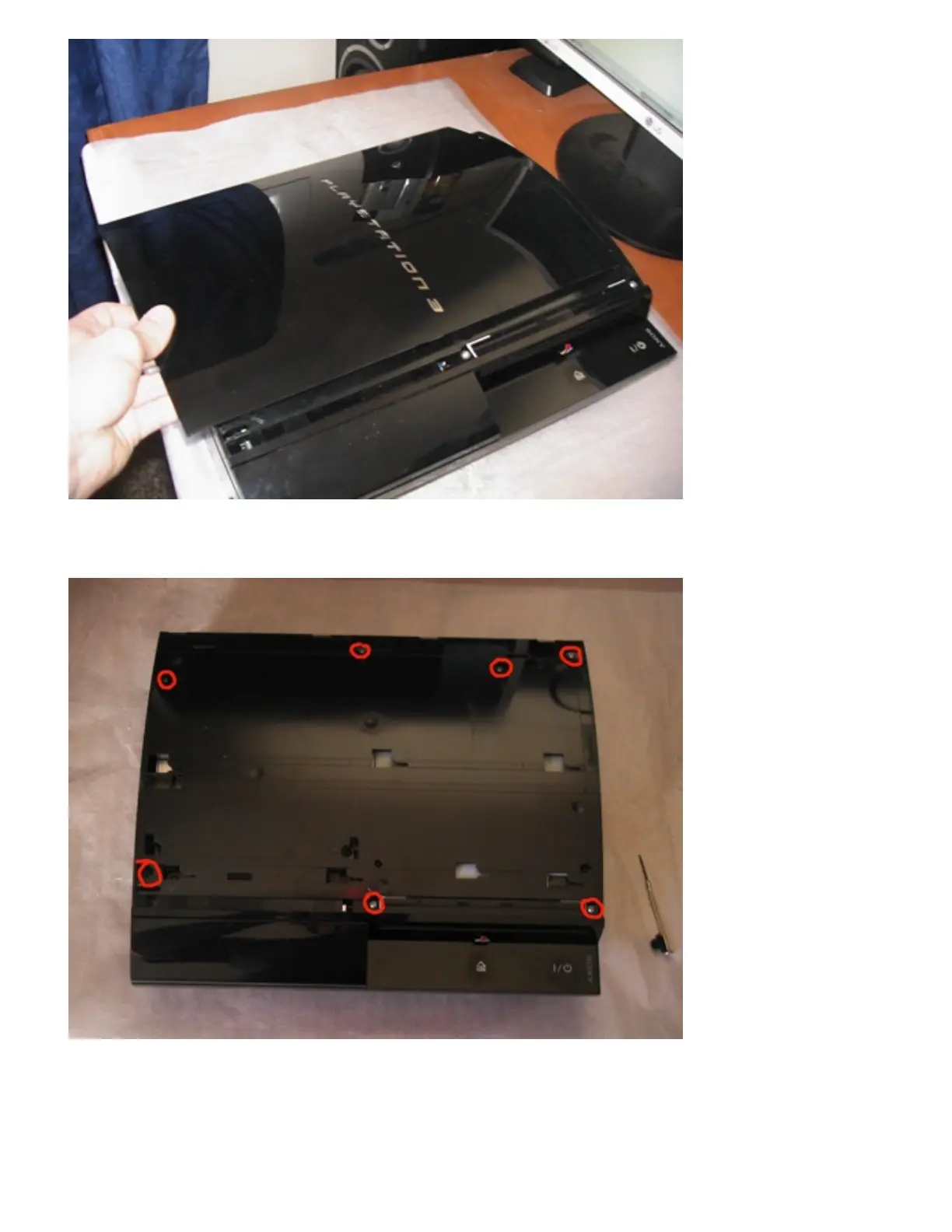 removing the 7 long screw circled in red in the picture below using a Phillips head screw driver.