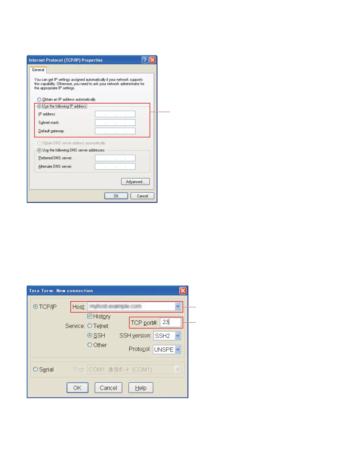 2. Set the connection destination to the IP address f a monitor and set the TCP port to 23.
