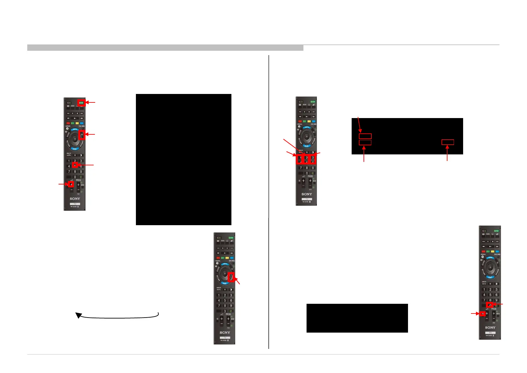2) Press “i+ (info)”, “5”, “Volume +” then “TV power” on remote.