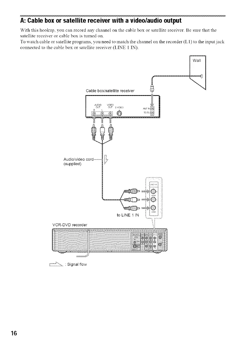 With this hookup, you can record any channe! on the cable box or satellite receiYer. Be snre that the