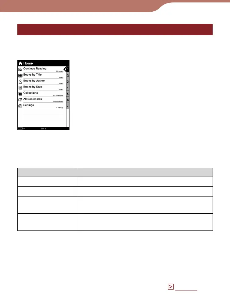 “Home” menu items to select a book