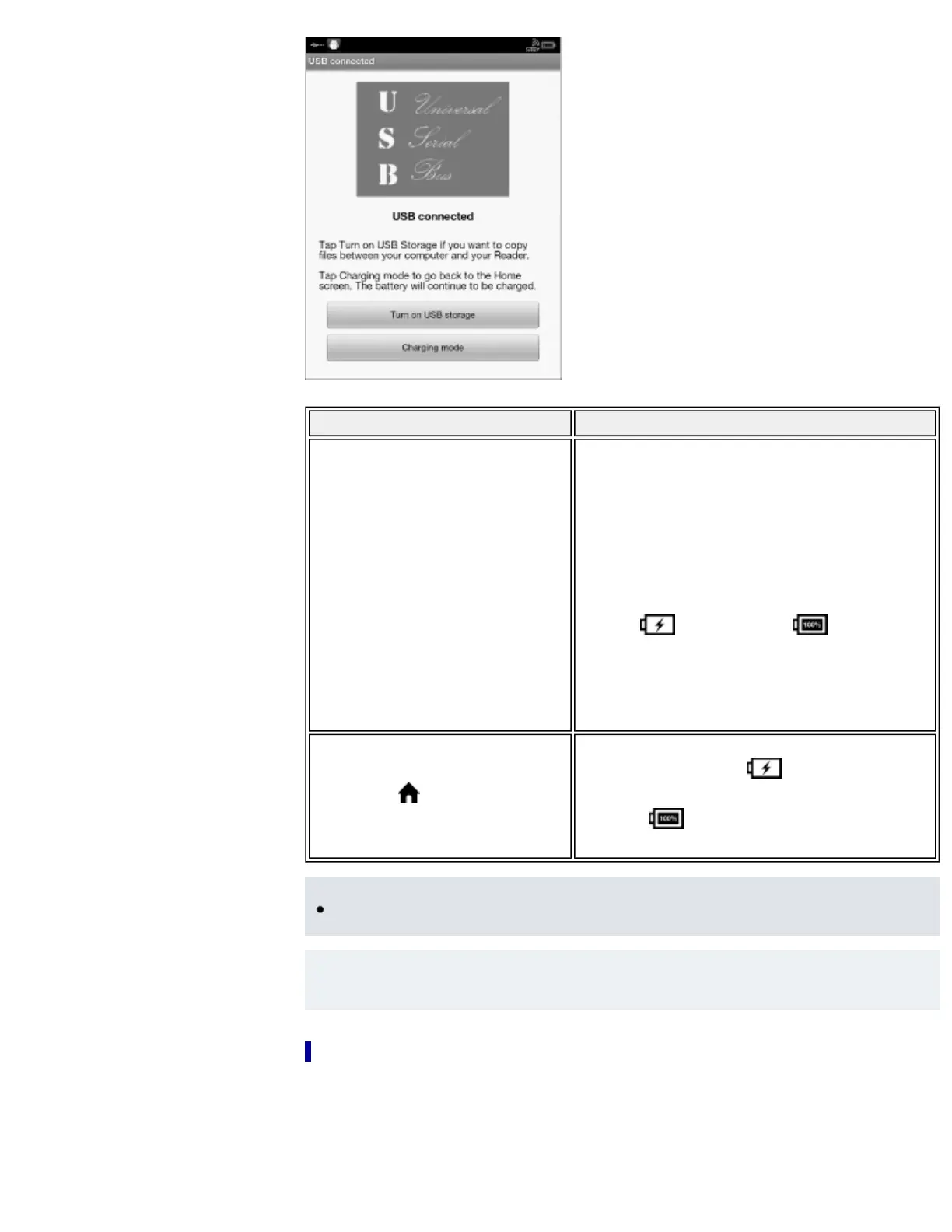 ● Your computer must be turned on to charge the Reader via USB mode. The Reader will not be charged if your computer enters sleep