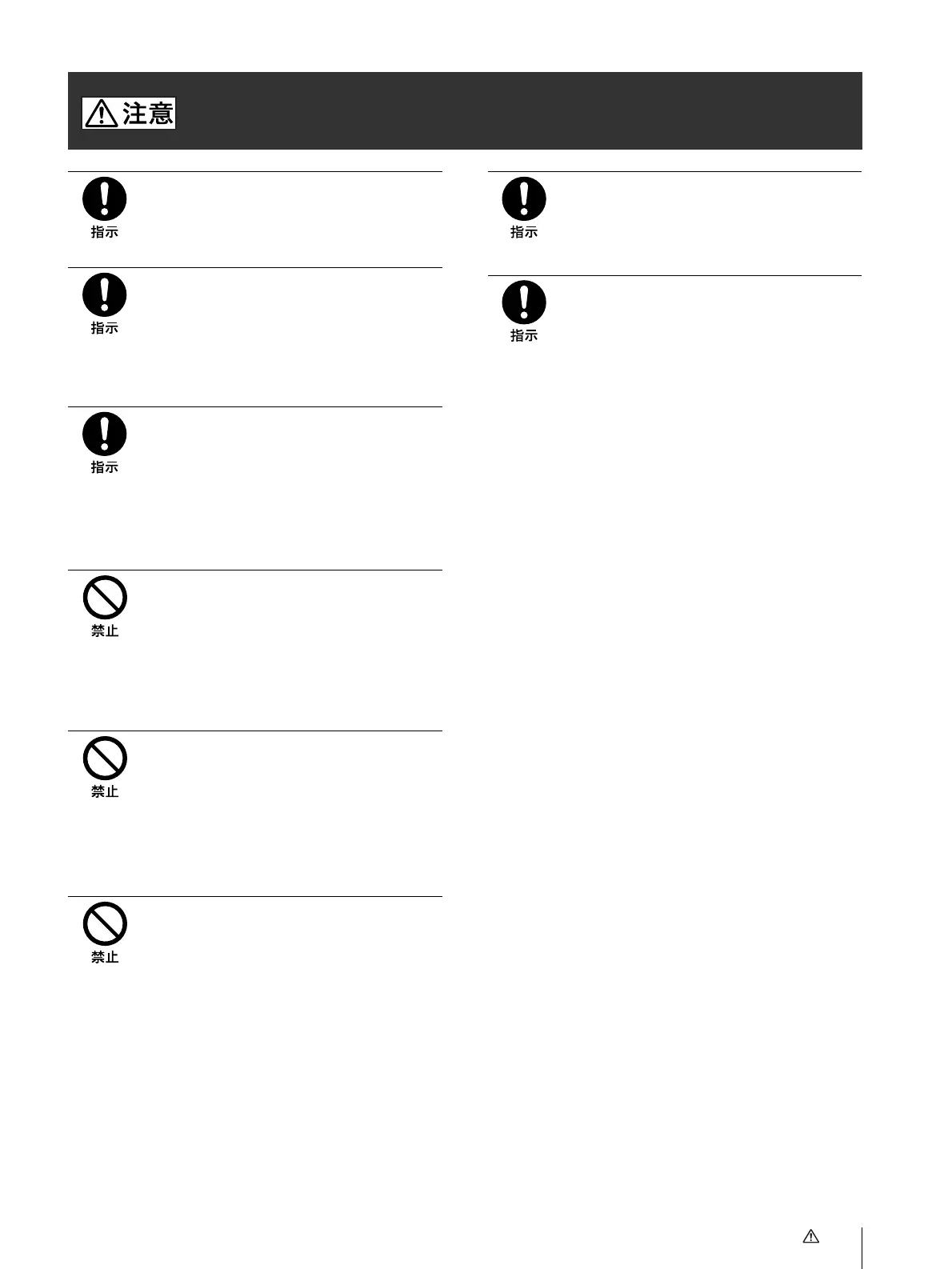 下記の注意を守らないと、けがをしたり周辺の物品に損害を与えることがあります。