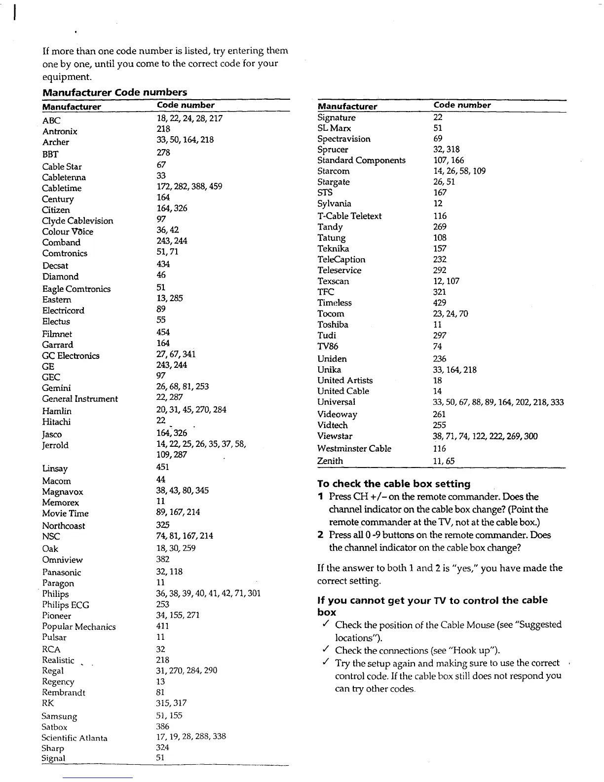 Sony RM-CM101 - Manufacturer Code numbers; Code Lookup for Setup