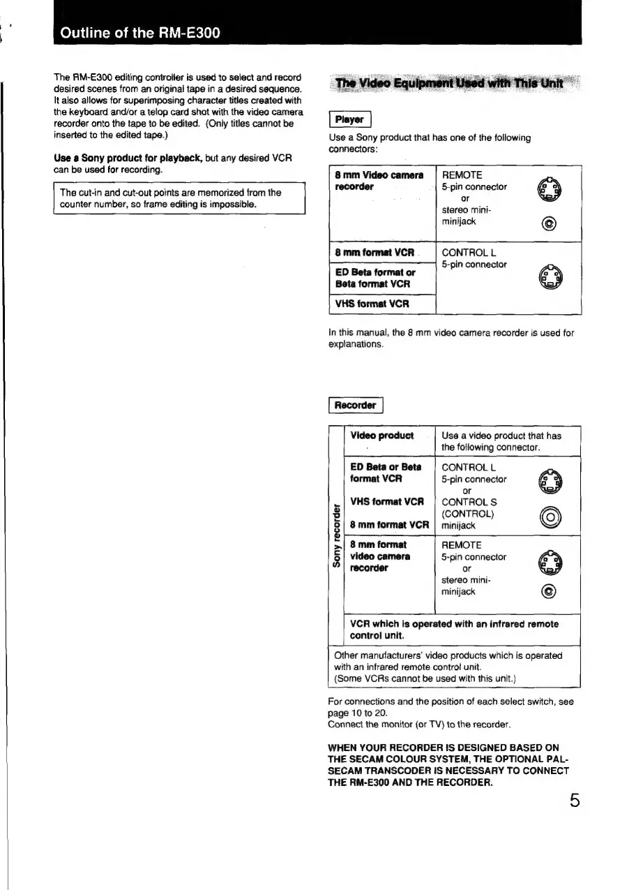 Sony RM-E300 - RM-E300 Overview and Compatibility; Compatible Video Equipment