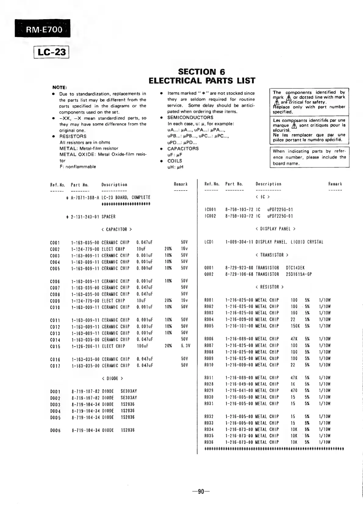 Sony RM-E700 - Parts List