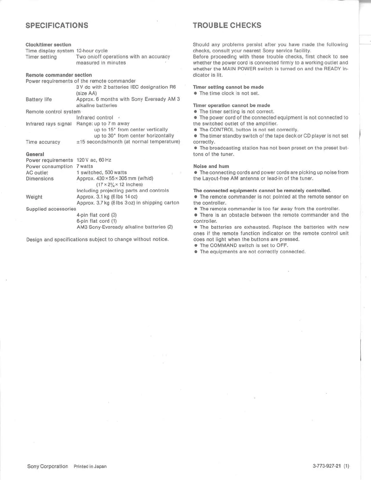 Sony RM-S410 - Specifications; Trouble Checks