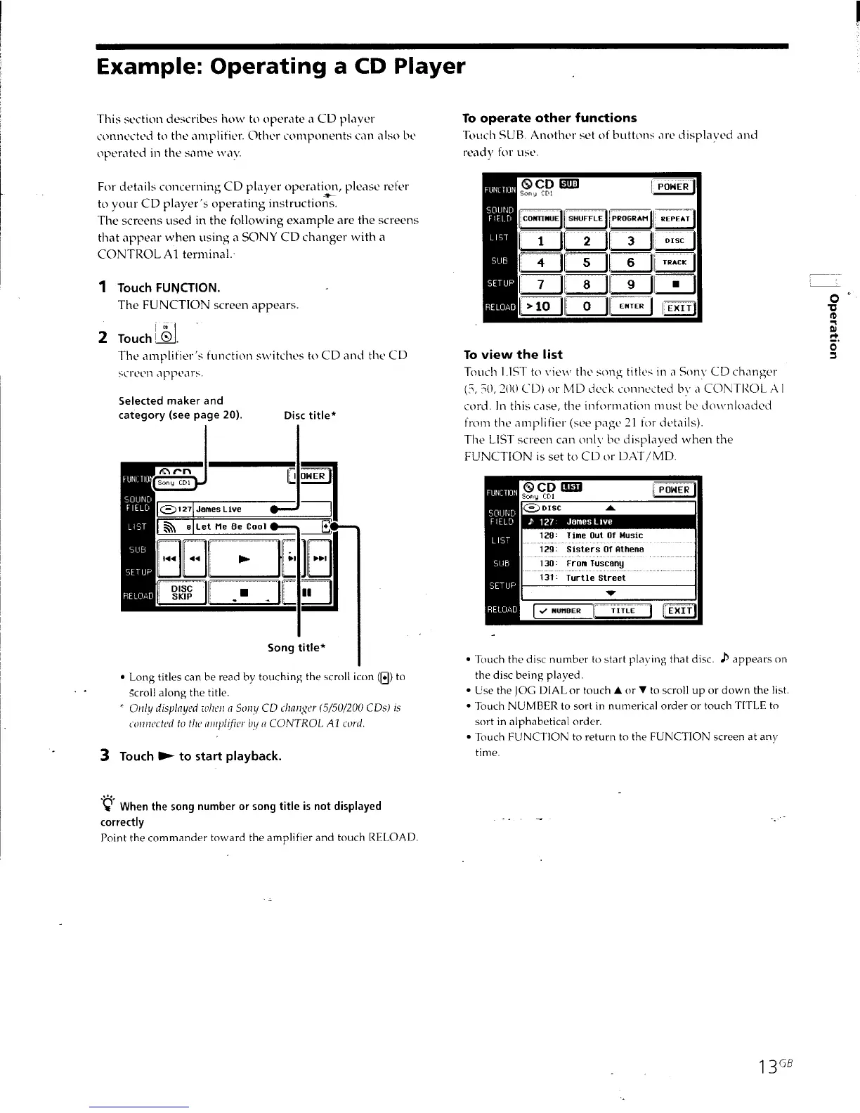 Sony RM-TP501E Primary - Operating a CD Player; To Operate Other Functions; To View the List