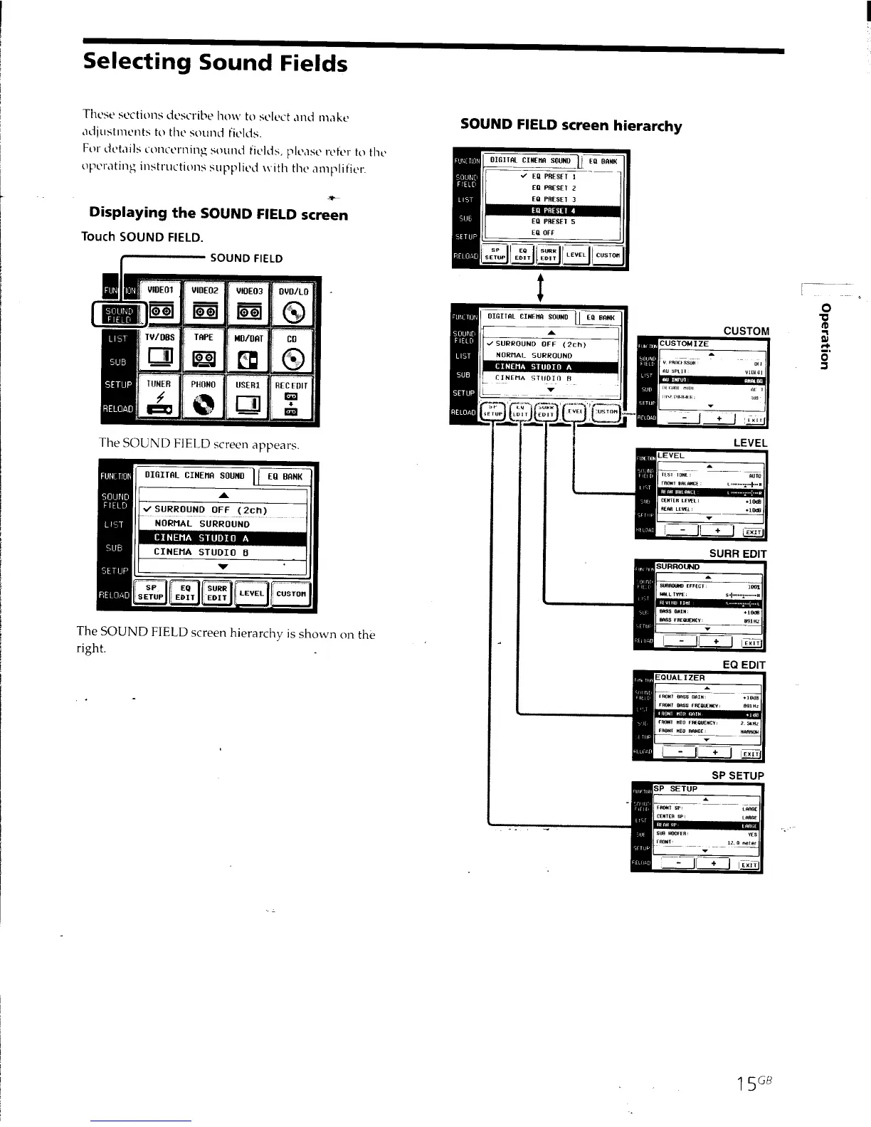 Sony RM-TP501E Primary - Selecting Sound Fields; Displaying the SOUND FIELD Screen; Sound Field Screen Hierarchy