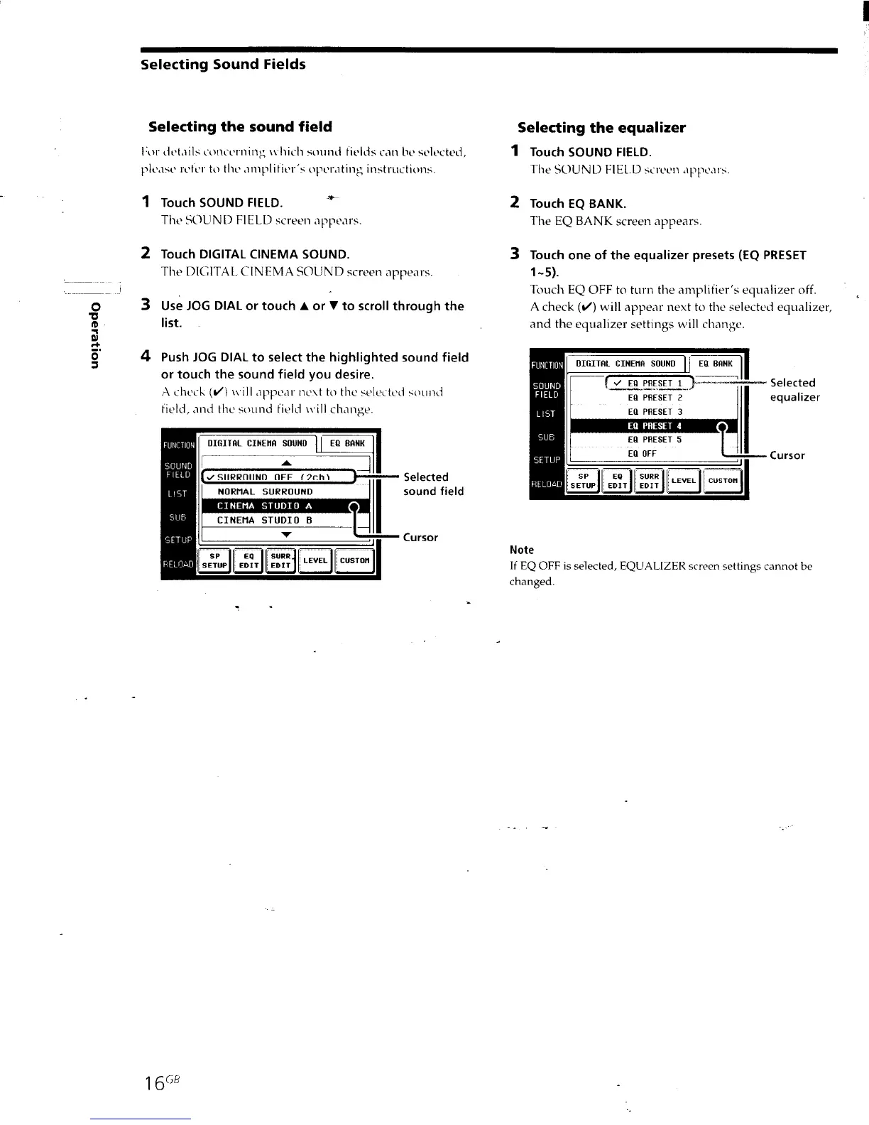 Sony RM-TP501E Primary - Selecting the Sound Field; Selecting the Equalizer