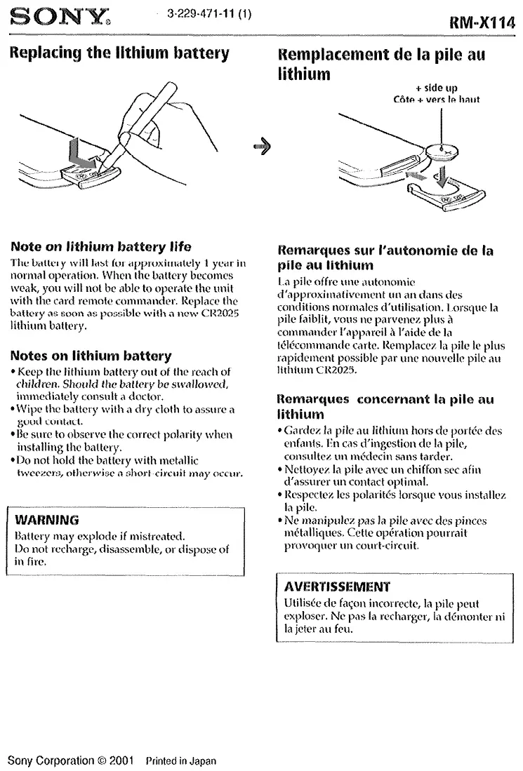 Sony RM-X114 - Replacing the Lithium Battery; Warning Regarding Battery