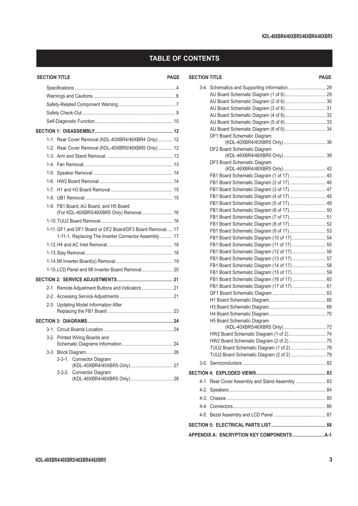 1-1. Rear Cover Removal (KDL-40XBR4/46XBR4 Only) ............ 12