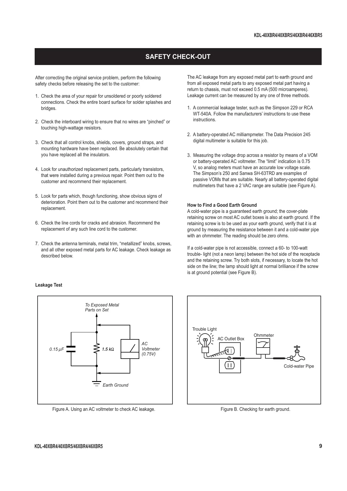 Figure A. Using an AC voltmeter to check AC leakage. Figure B. Checking for earth ground.