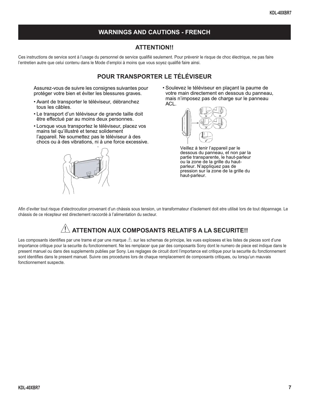 present manuel ou dans des supplements publies par Sony. Les reglages de circuit dont l’importance est critique pour la securite du fonctionnement