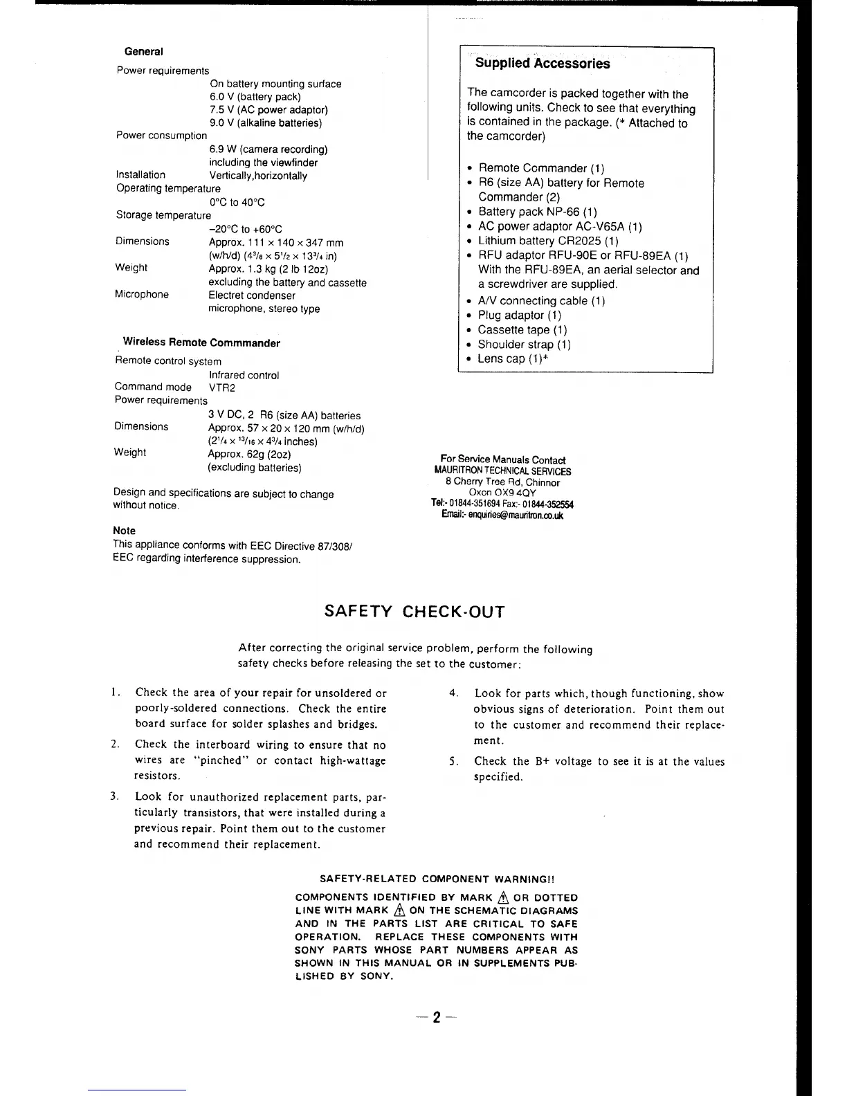 Sony RMT-502 - General and Safety Information; General Power Requirements; Supplied Accessories; Safety Check-out Procedure