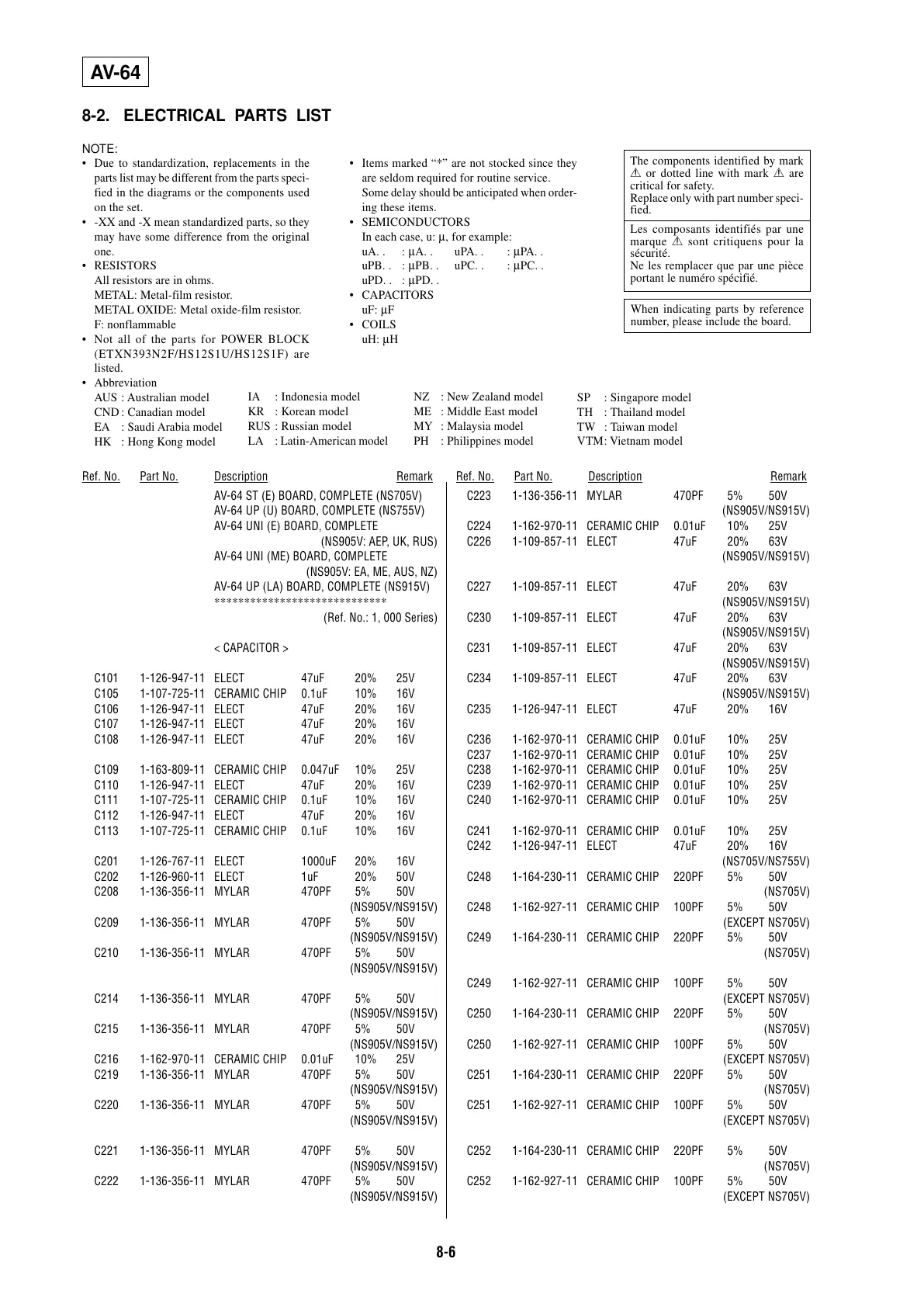 8-2. ELECTRICAL PARTS LIST