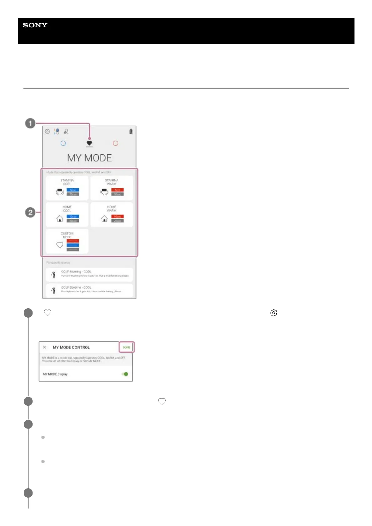 In MY MODE, you can set a series of actions such as “WARM → Interval → COOL → Interval → WARM → …” by