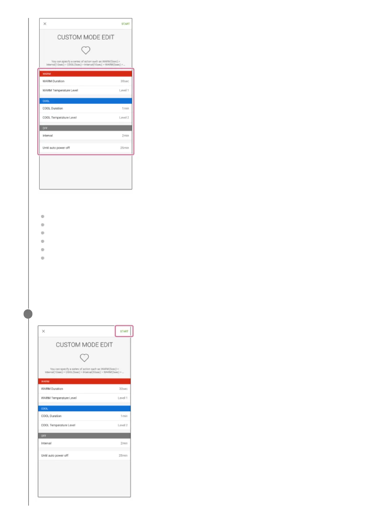 Running in WARM (Level 1) for 30 seconds → Interval for 2 minutes → Running in COOL (Level 2) for 1 minute →