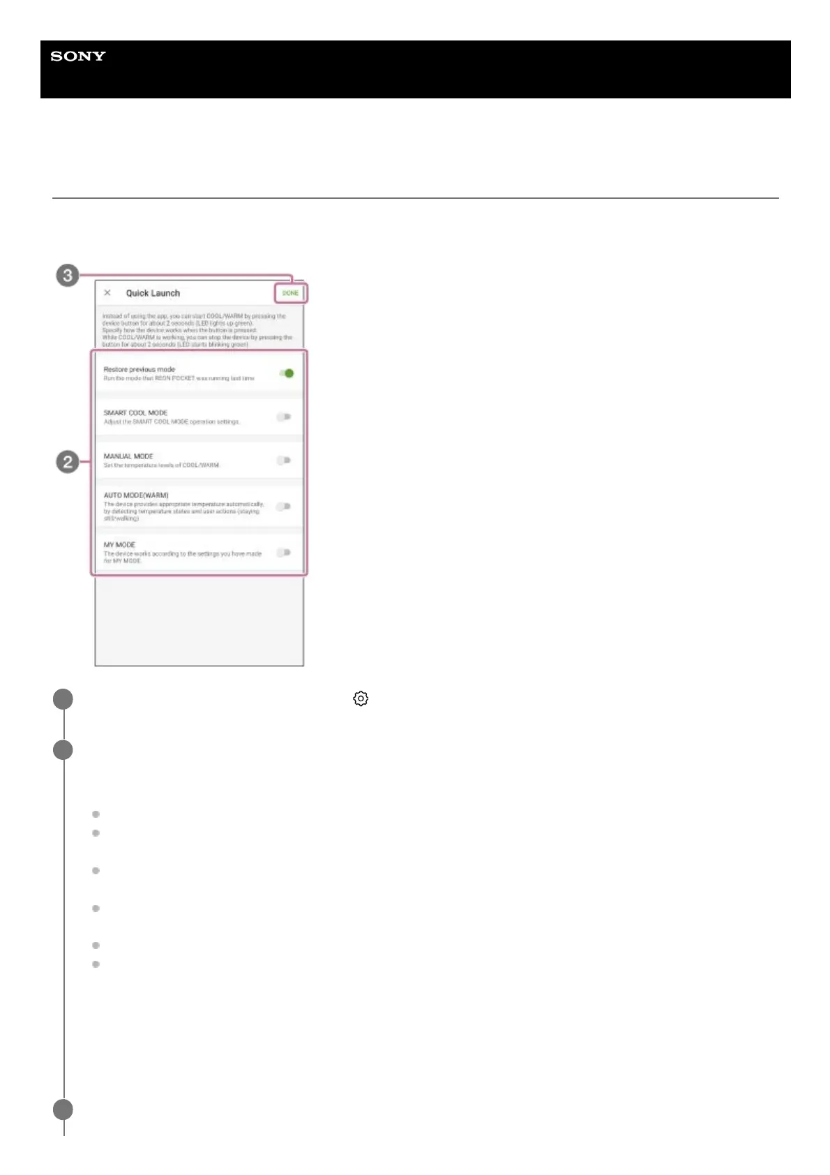 smartphone. In advance, set the operating mode for the QUICK LAUNCH function on the “REON POCKET” app.