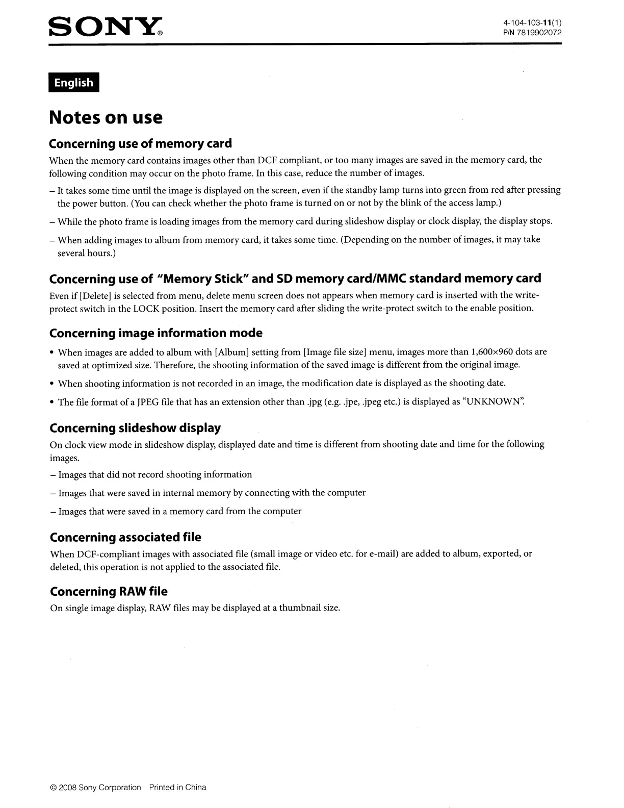 © 2008 Sony Corporation Printed