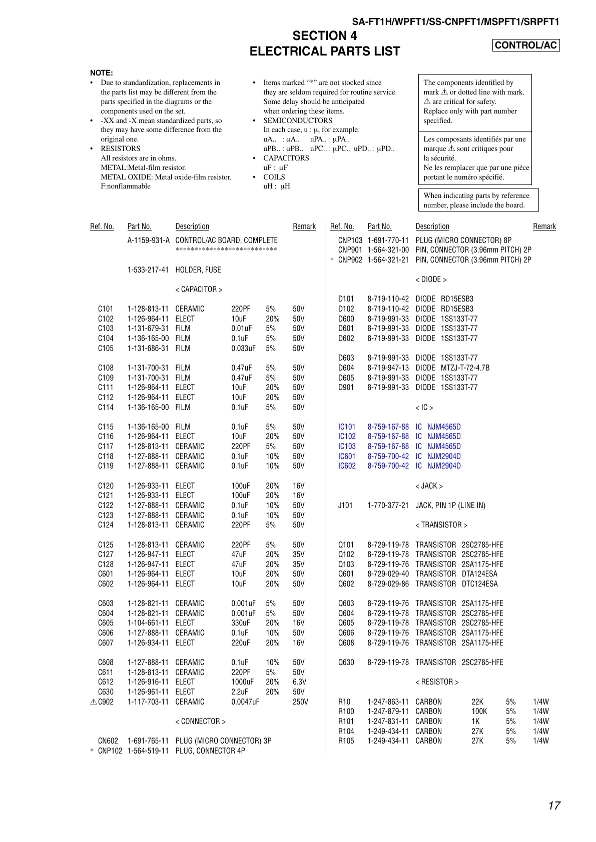 ELECTRICAL PARTS LIST