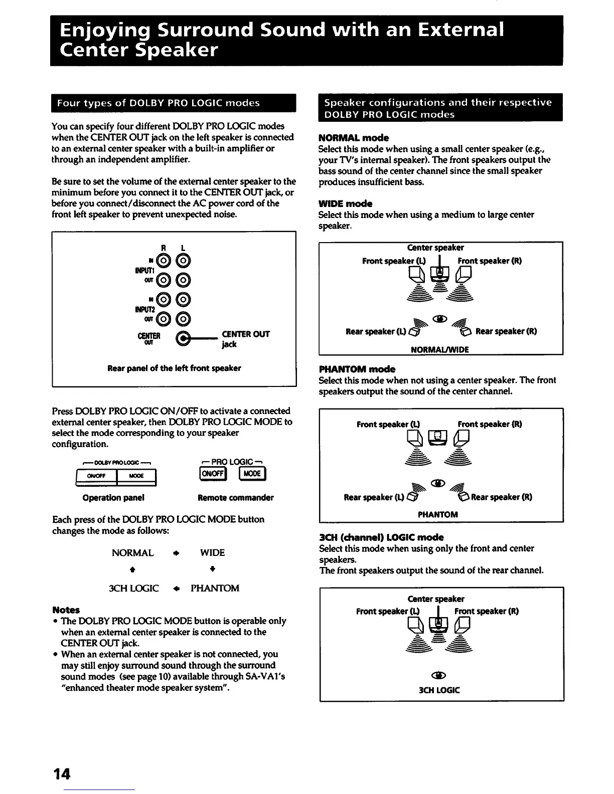Sony SA-VA1 - External Center Speaker Modes; Four Dolby Pro Logic Modes; Speaker Configuration Mode Mapping