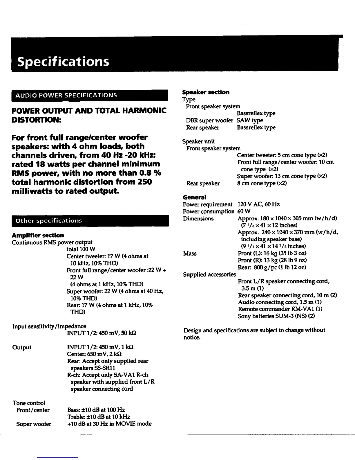Sony SA-VA1 - Specifications