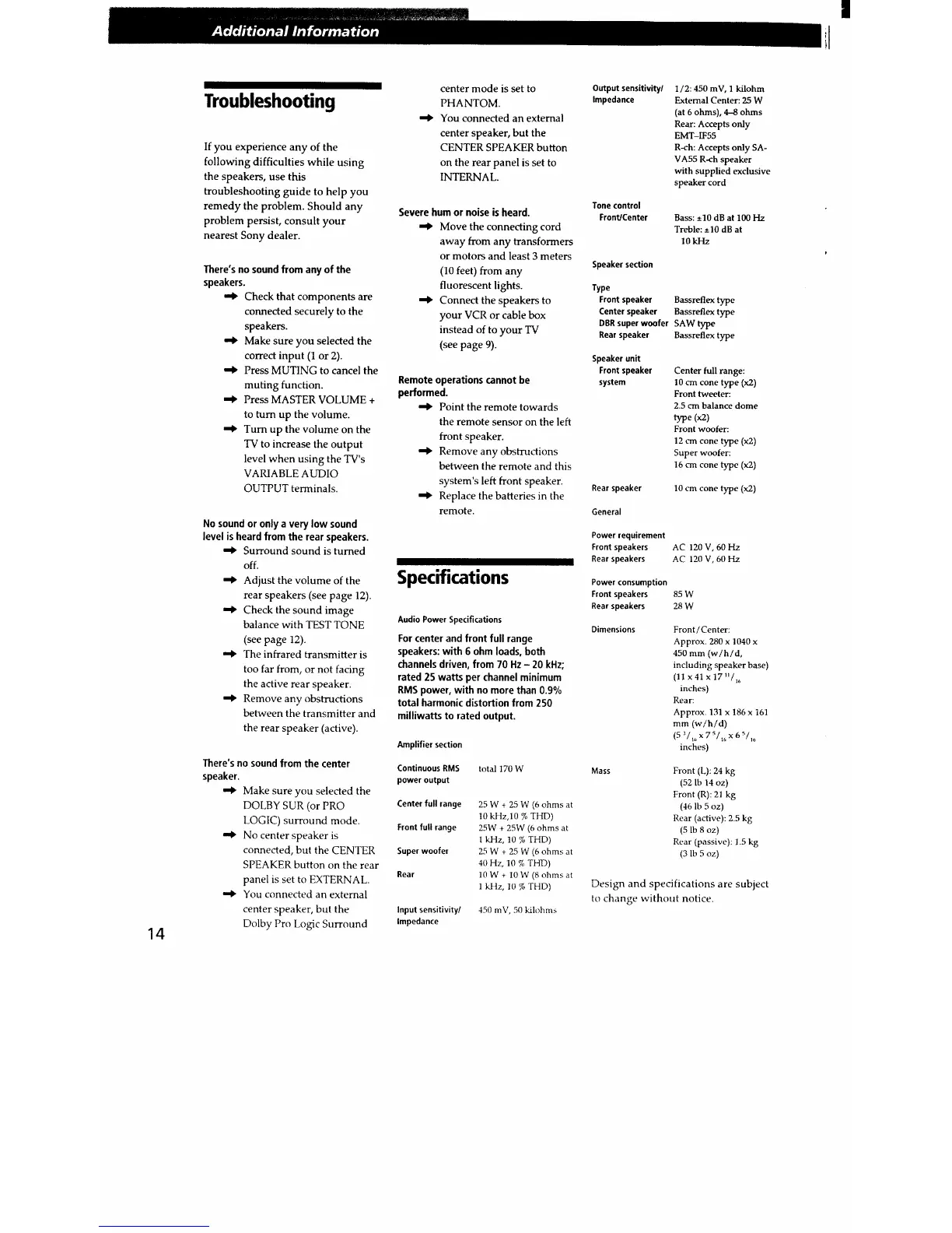 Sony SA-VA55 - Troubleshooting and Specifications; Troubleshooting Common Issues; System Specifications