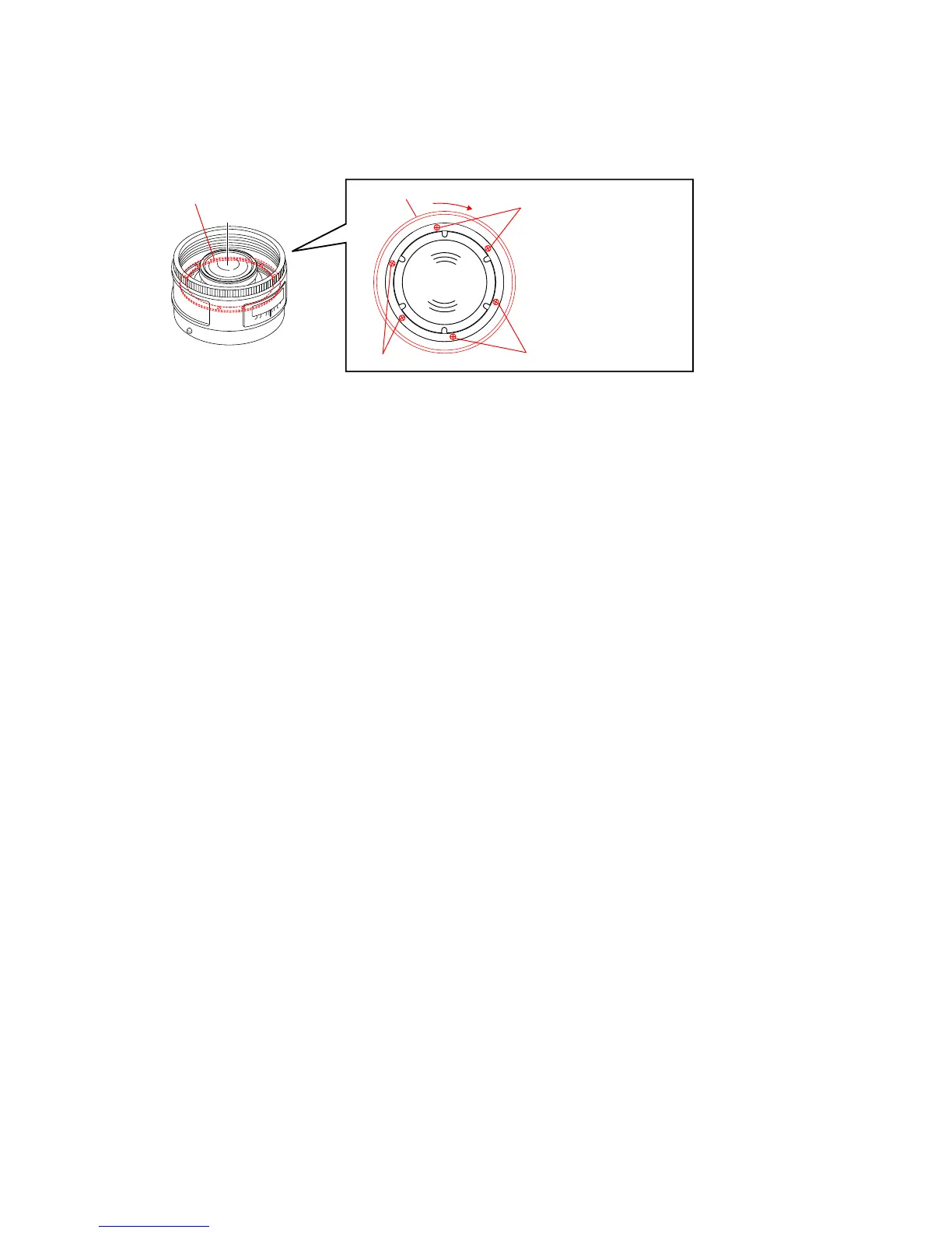 5) Loosen the three screws fixing the focus ring holding plate, and set the focus ring to the infinity stop position without moving the
