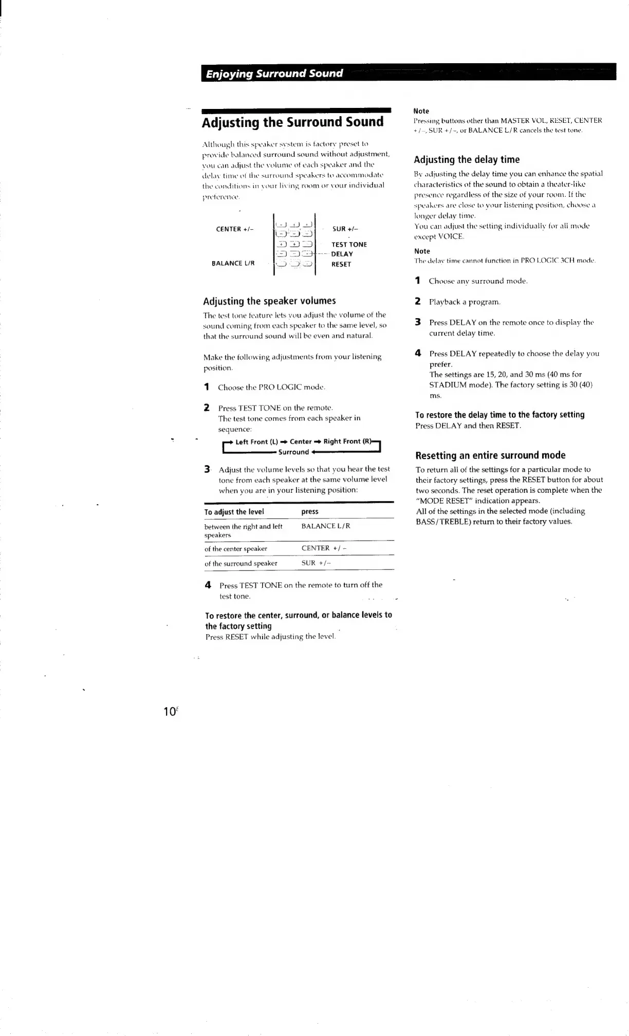 Sony SAVA-7 - Sound Adjustment; Adjusting Surround Sound Levels