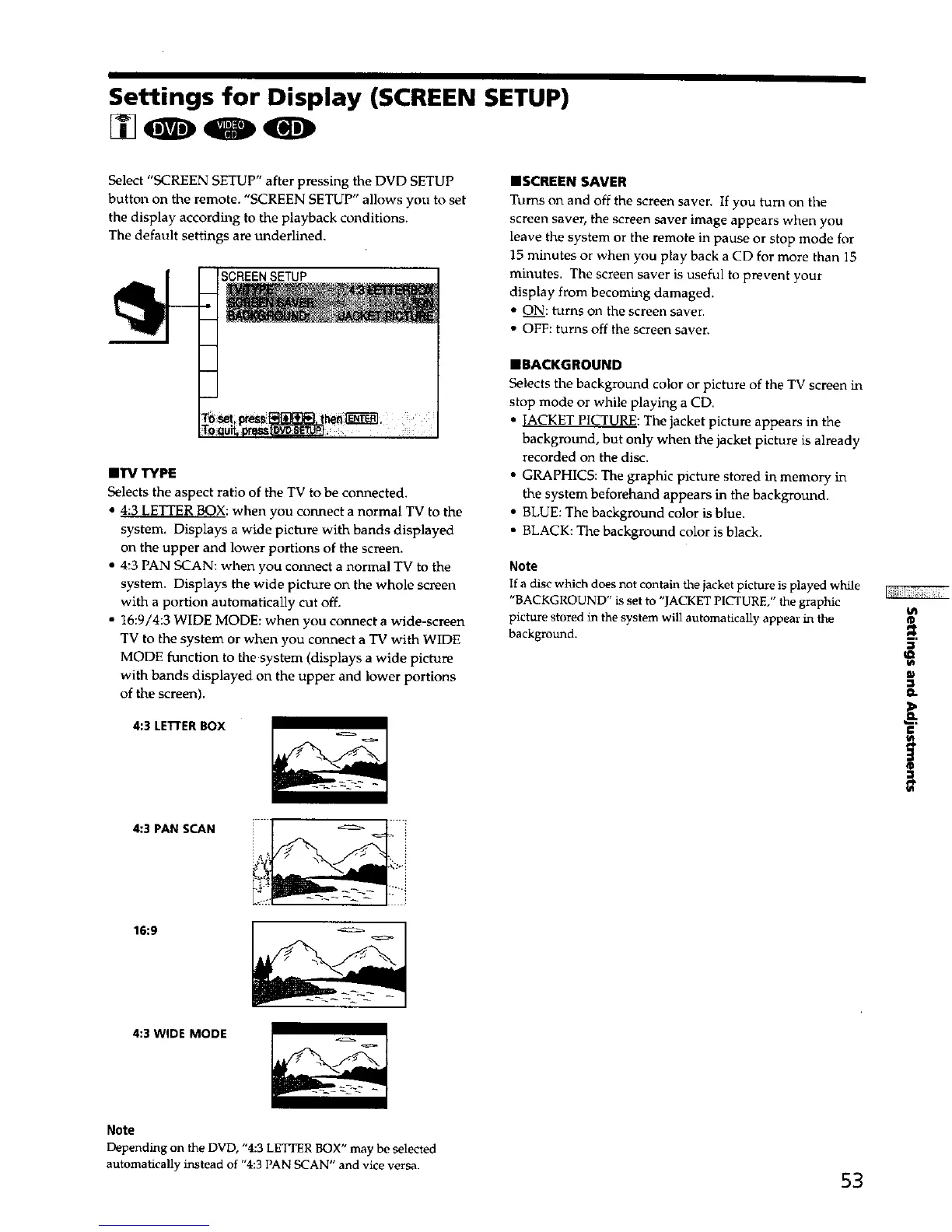 button on the remote. "SCREEN SETUP" allows you to set