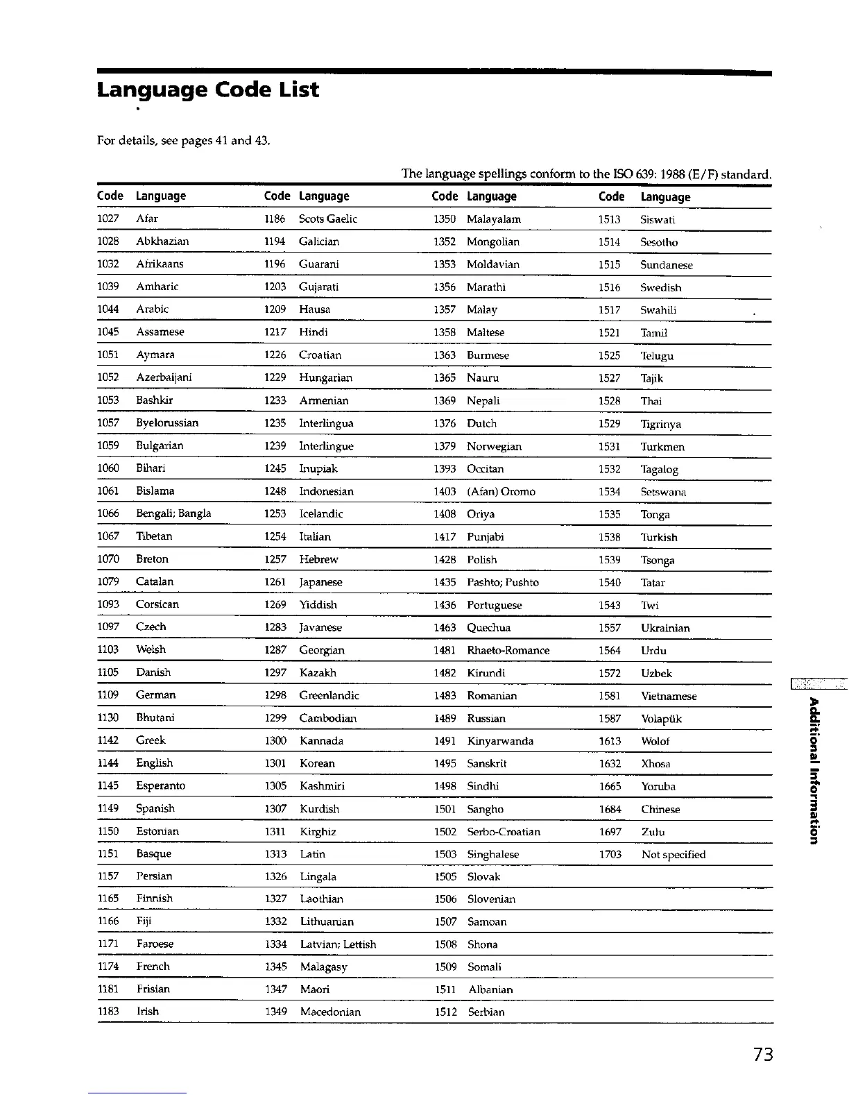 The language spellings conform to the ISO 639:1988 (E/F) standard.