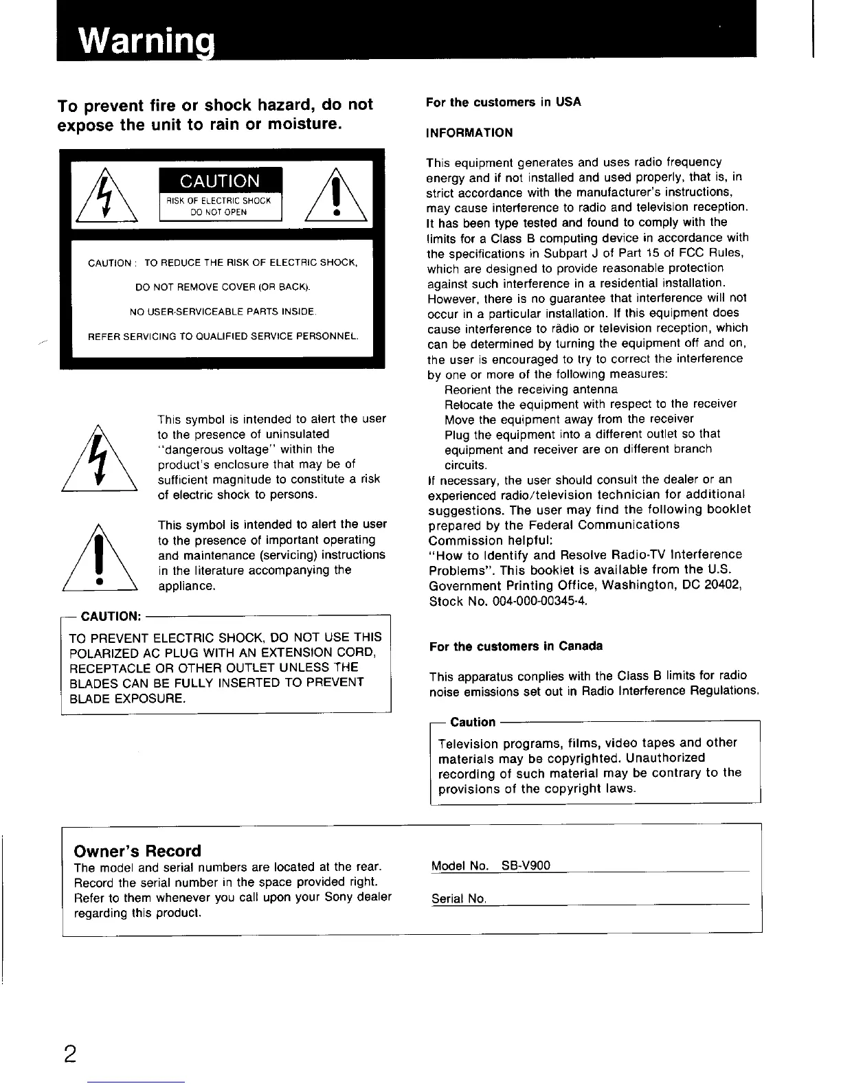 Sony SB-V900 - Warning; Safety and Electrical Precautions