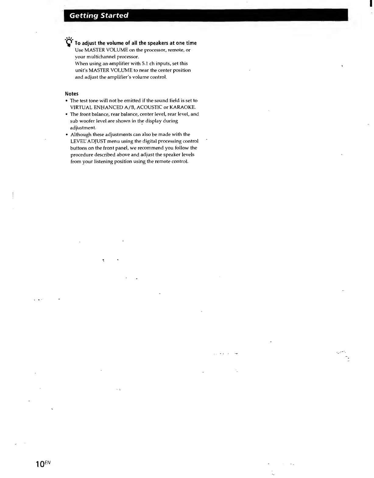 Sony SDP-E800 - Getting Started: Master Volume and Sound Field Notes; Master Volume Adjustment; Test Tone Limitations
