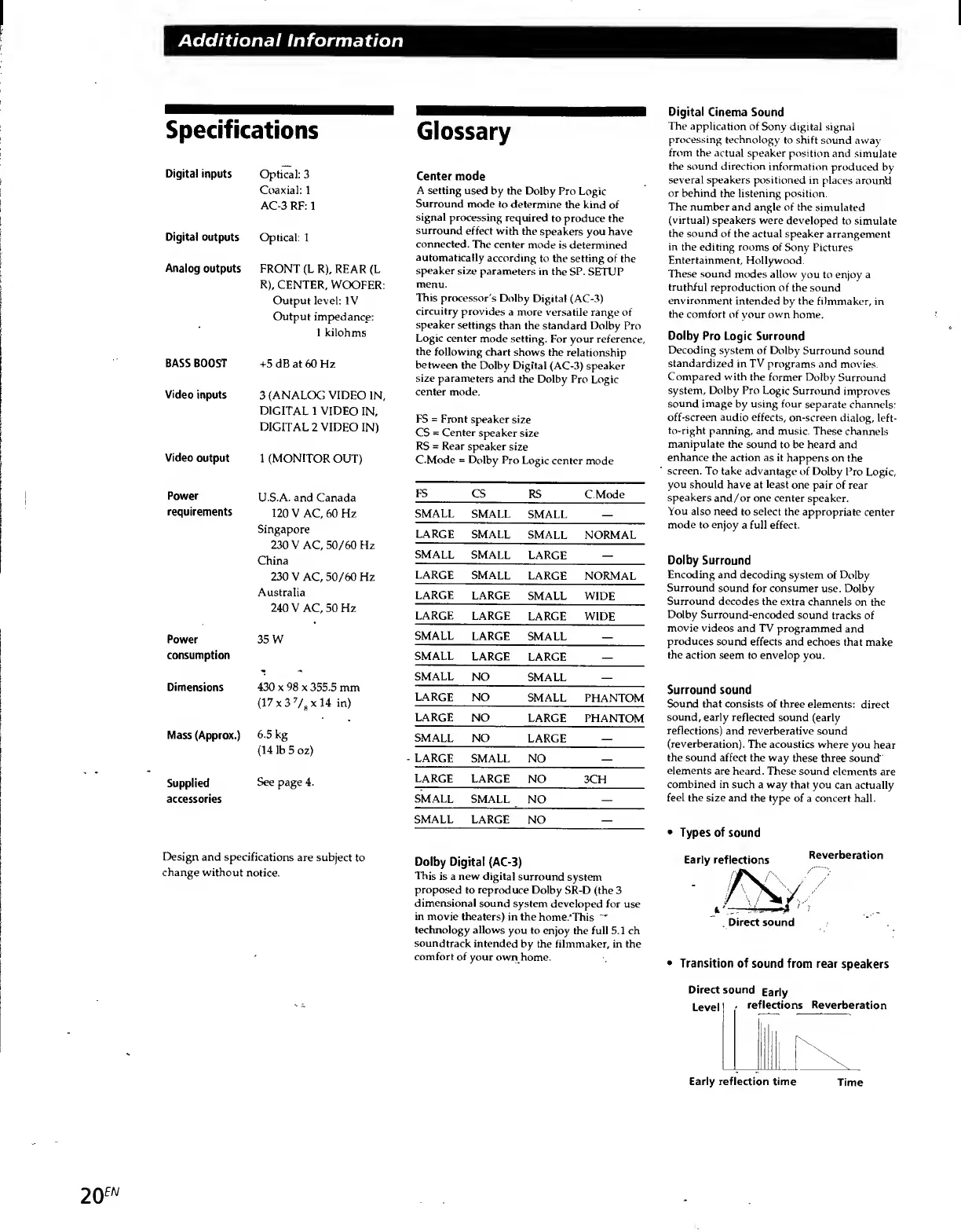 Sony SDP-E800 - Additional Information: Specifications and Glossary; Specifications; Glossary: Center Mode; Glossary: Digital Cinema Sound