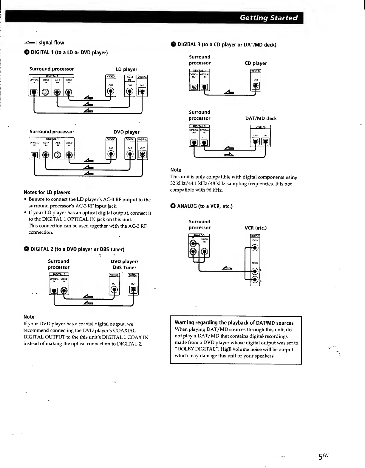 Sony SDP-E800 - Getting Started: Connections and Notes; Digital Source Connections; Analog Source Connections; Important Notes and Warnings