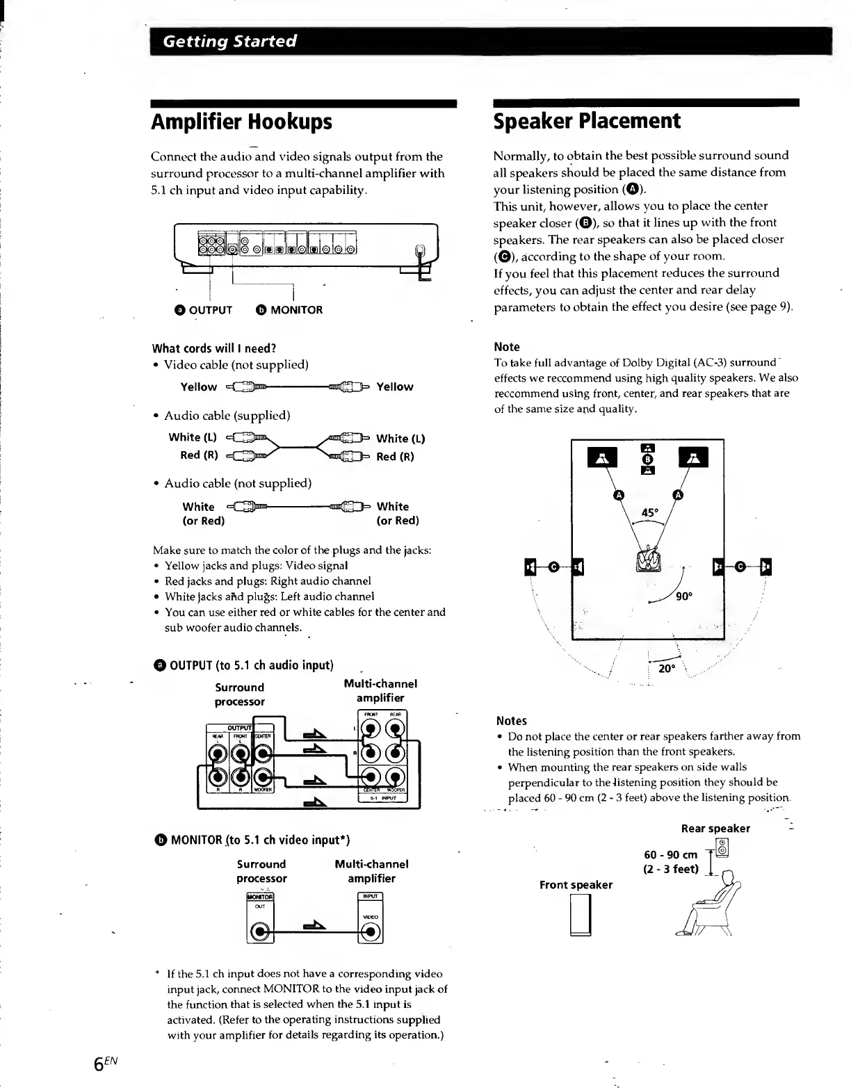 Sony SDP-E800 - Getting Started: Amplifier and Speaker Setup; Amplifier Hookups; Speaker Placement