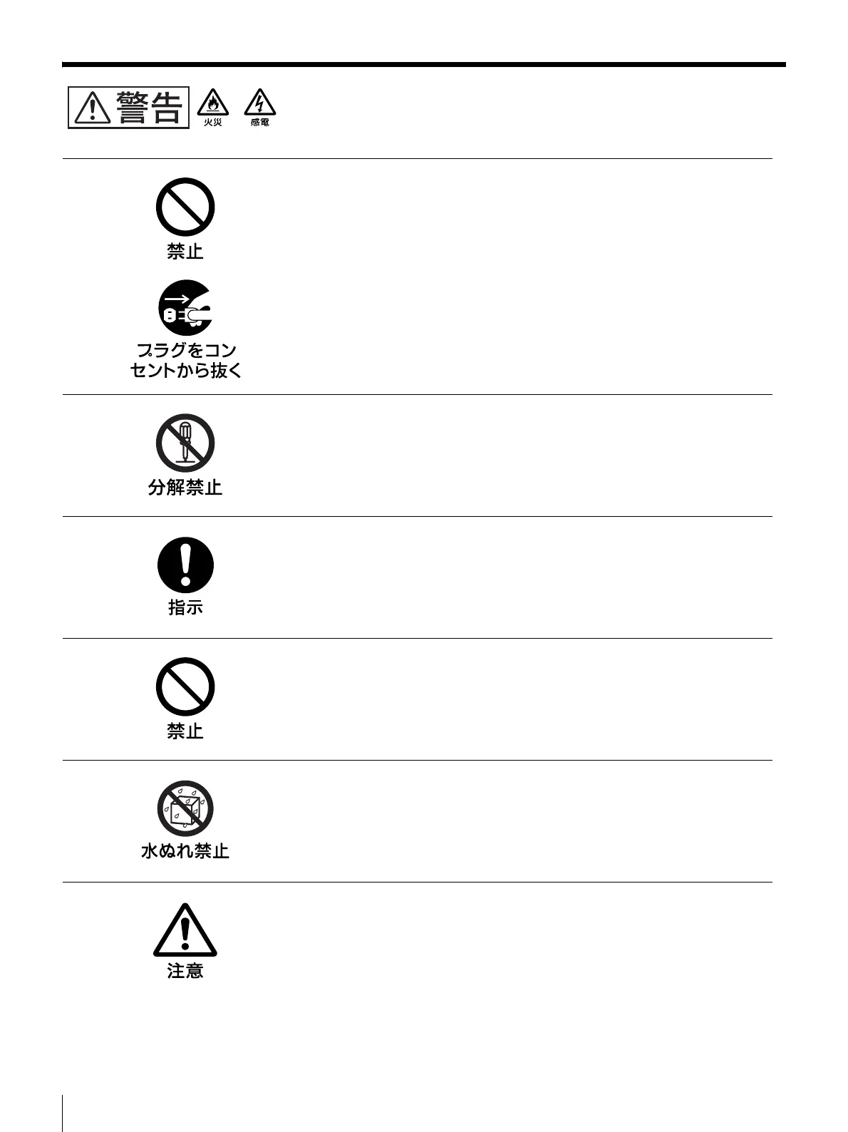 水が入ったり、ぬれたりすると、火災や感電の原因となることがあります。