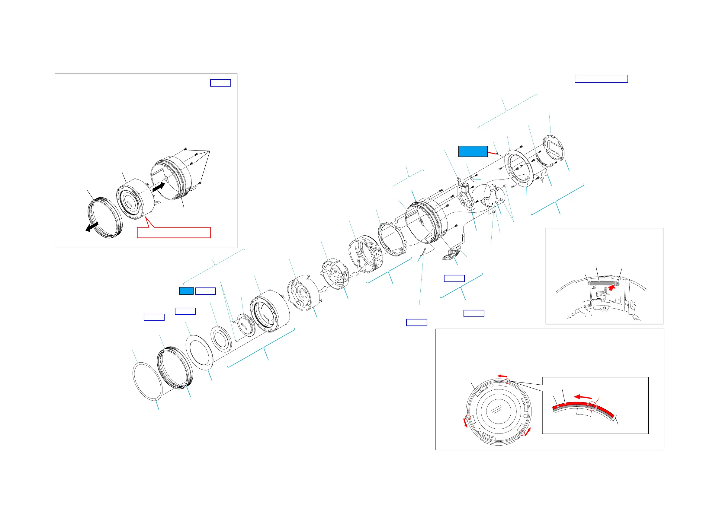 光学部組を分解させないよう固定保持環Assyを外す際は必ず下記の手順で