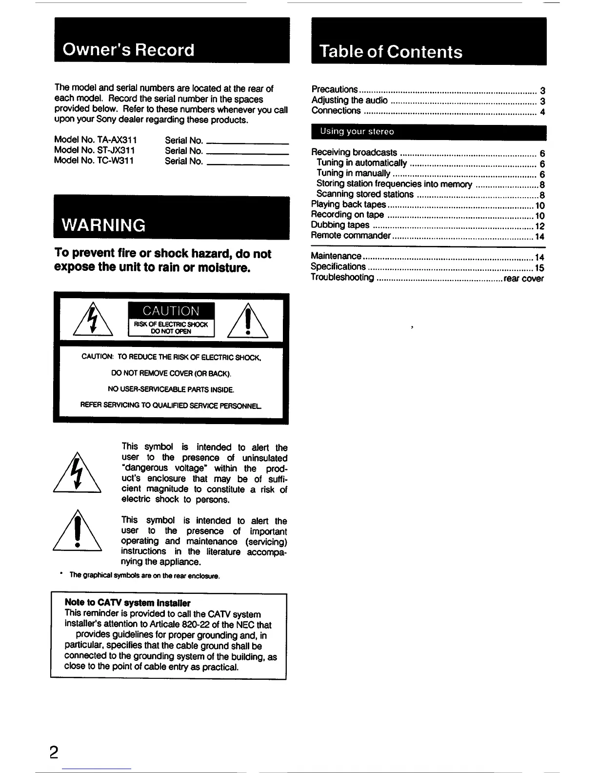 Sony SEN-311 - Owners Record; Safety Warnings and Precautions; General Safety Precautions; Electrical Shock Hazard Symbol