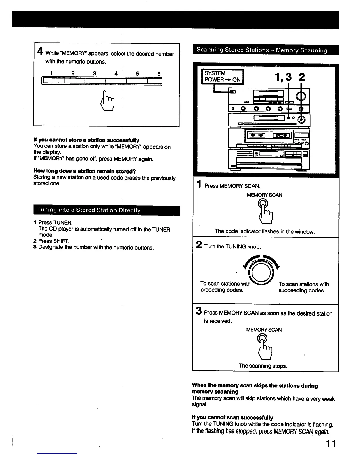 Sony SEN-421CD - Tuning into a Stored Station Directly; Scanning Stored Stations - Memory Scanning