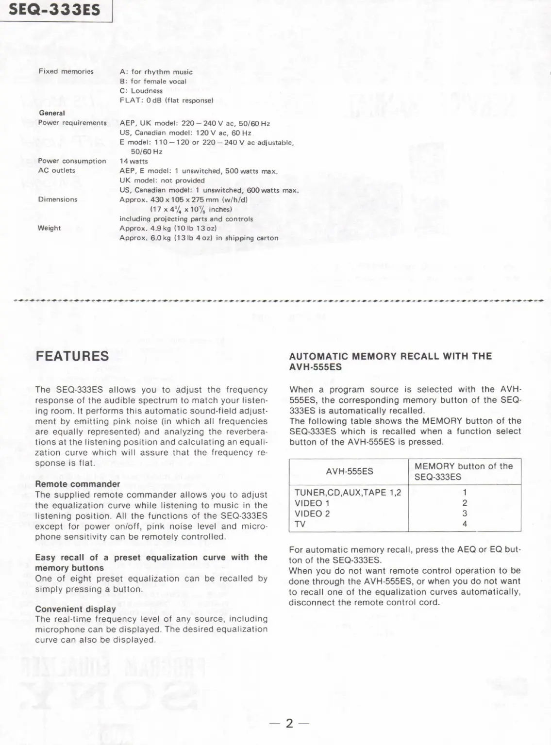 Sony SEQ-333ES - FEATURES; Remote Commander; Memory Button Recall; Convenient Display